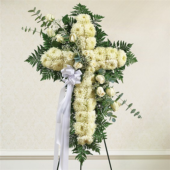 Honor a lifetime of faithful devotion with our beautiful standing cross arrangement. Our expert florists handcraft each of these impressive displays with a bed of white mums in the shape of a cross, and accent with a cascade of crisp white roses. It is a beautiful way to offer peace and comfort during a difficult time.